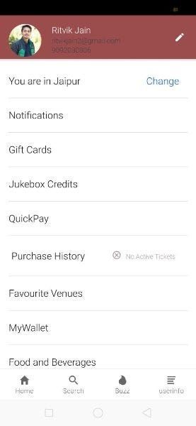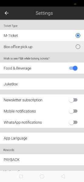 This page can be accessed by clicking on the settings on the Userinfo page. In any app, settings page plays an important role in setting user’s preferences and requirement, here user can set the preferences for Push Notification, Email Notifications, and Whatsapp notifications, Mobile notification etc. This page allows you to toggle some preferences and navigates to other pages to select choices. This page allows the user to select theM-ticket, Box office pickup, enable and disable food beverages, newsletters, managing push, mobile, Whatsapp, and email notifications, sharing the app with friends and contacts, and to delete account from the app.
