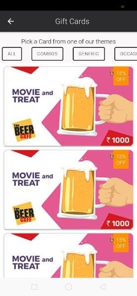 This page can be accessed from the userinfo page. By clicking on the Gift cards text it navigates to this page. This page contains all the offers for the user to use while booking for an event or movies.