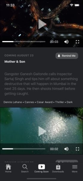 This is the third tab of the application. This tab contains all the upcoming movie trailers and short videos. By clicking on any of the movies it plays the video.