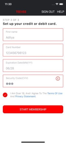 This page can be accessed from the create an account page by clicking on the continue button at the bottom of the page. This page contains the payment methods for the subscription of the application. This page navigates to the Home page.