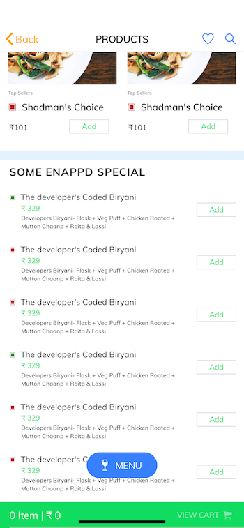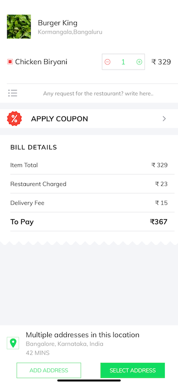 This page can be accessed from the restaurant’s list page’s, besides the restaurant selected by the category, there are some options to select other categories of your choice and it will navigate to the cart page by clicking on the view cart at the very bottom right of the page.