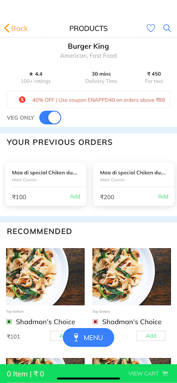 This page can be accessed by clicking on the restaurant's list page’s. This page contains the list of previous orders from the same restaurant. This page allows us to repeat order from the previously ordered items. The previous orders are arranged in a vertical list at the top of the page.