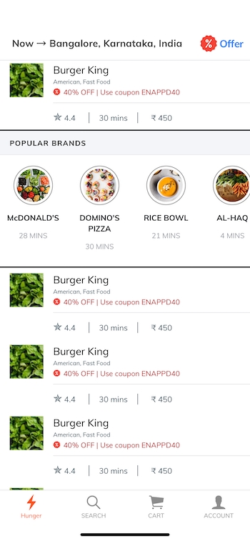 Here the list of all restaurant is available according to the category you selected. In this page, we have all the restaurants offering foods to avail and top restaurants list. By clicking on any restaurant it will navigate to restaurant products details page.