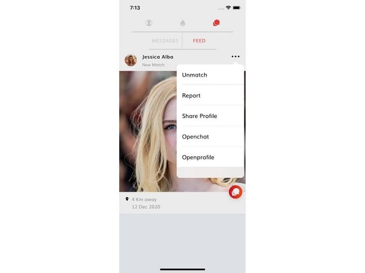 This page can be accessed by clicking on the third segment of the home page. This segment has nested segments including “MESSAGES” and “FEED”. This page contains the list of people matched and contacted on dating app. By clicking on any contact you can start chatting with him/her.
